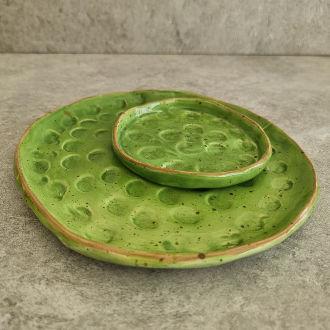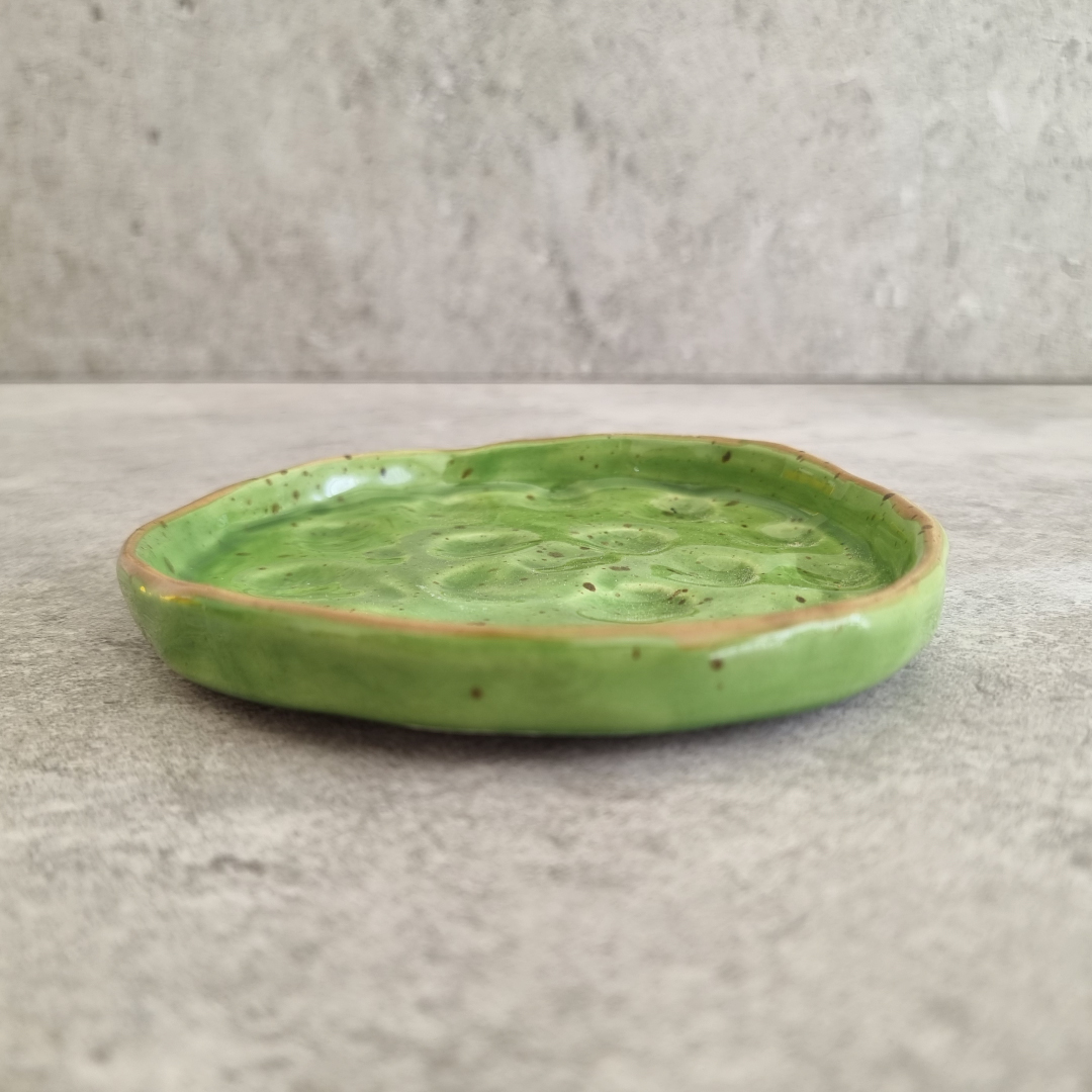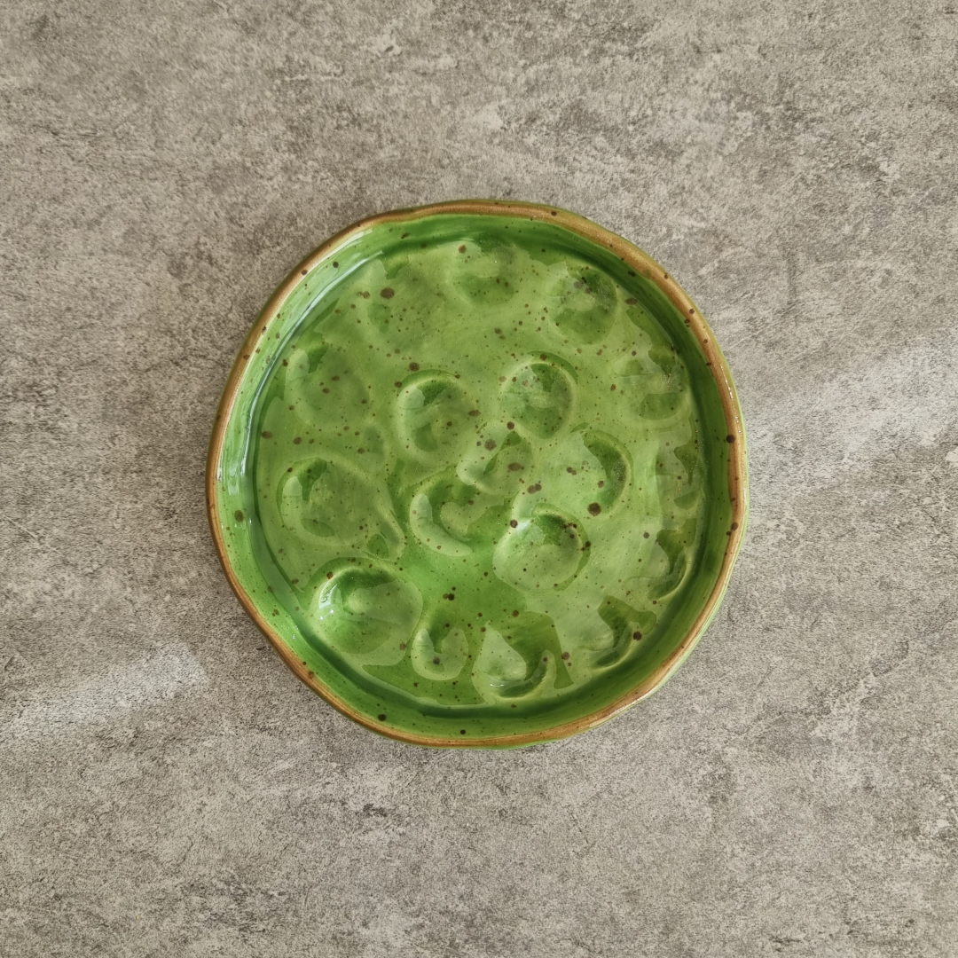 Crafted by Ala Khalil in collaboration with skilled women artisans from Jordan, this small textured Green plate is a true work of art. Each piece is meticulously handmade and painted manually, ensuring every plate is one-of-a-kind. This 13 cm plate is perfect for various uses with its intricate dot detailing and textured finish. Whether as a holder for cups, an accessories dish, or a stylish incense and smudge holder, this versatile design adds a touch of elegance to any space.