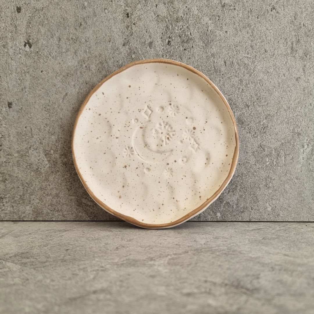 Crafted by Ala Khalil in collaboration with skilled women artisans from Jordan, this small textured matt white plate is a true work of art. Each piece is meticulously handmade and painted manually, ensuring every plate is one-of-a-kind. This 13 cm plate is perfect for various uses with its intricate dot detailing and textured finish. Whether as a holder for cups, an accessories dish, or a stylish incense and smudge holder, this versatile design adds a touch of elegance to any space.
