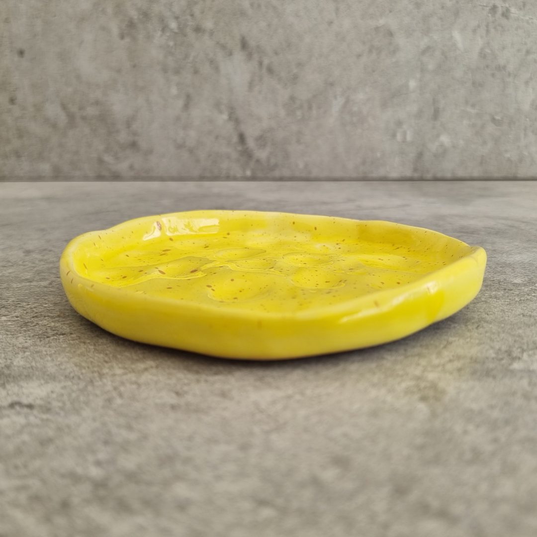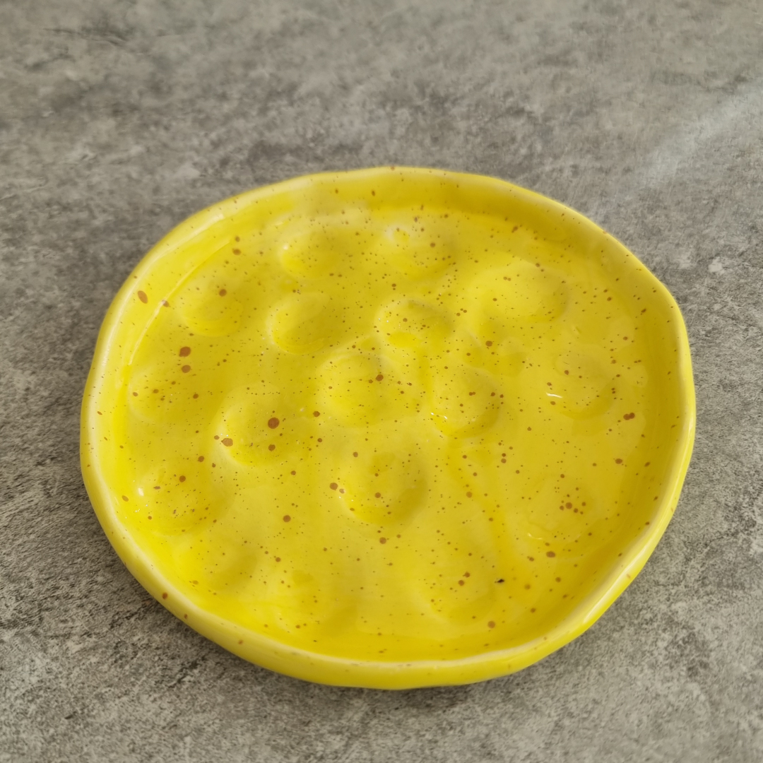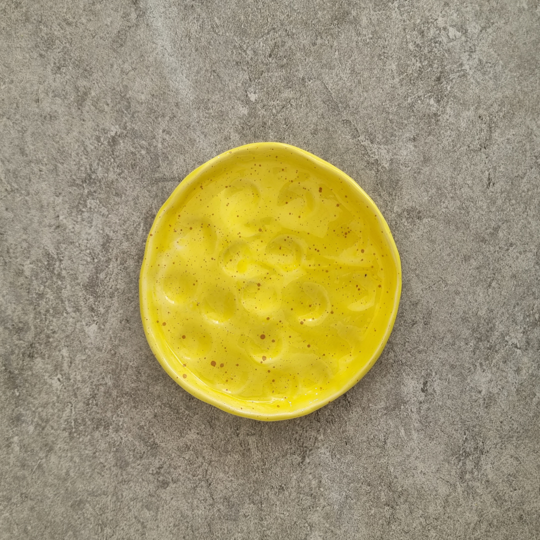 Crafted by Ala Khalil in collaboration with skilled women artisans from Jordan, this small textured Yellow plate is a true work of art. Each piece is meticulously handmade and painted manually, ensuring every plate is one-of-a-kind. This 13 cm plate is perfect for various uses with its intricate dot detailing and textured finish. Whether as a holder for cups, an accessories dish, or a stylish incense and smudge holder, this versatile design adds a touch of elegance to any space.
