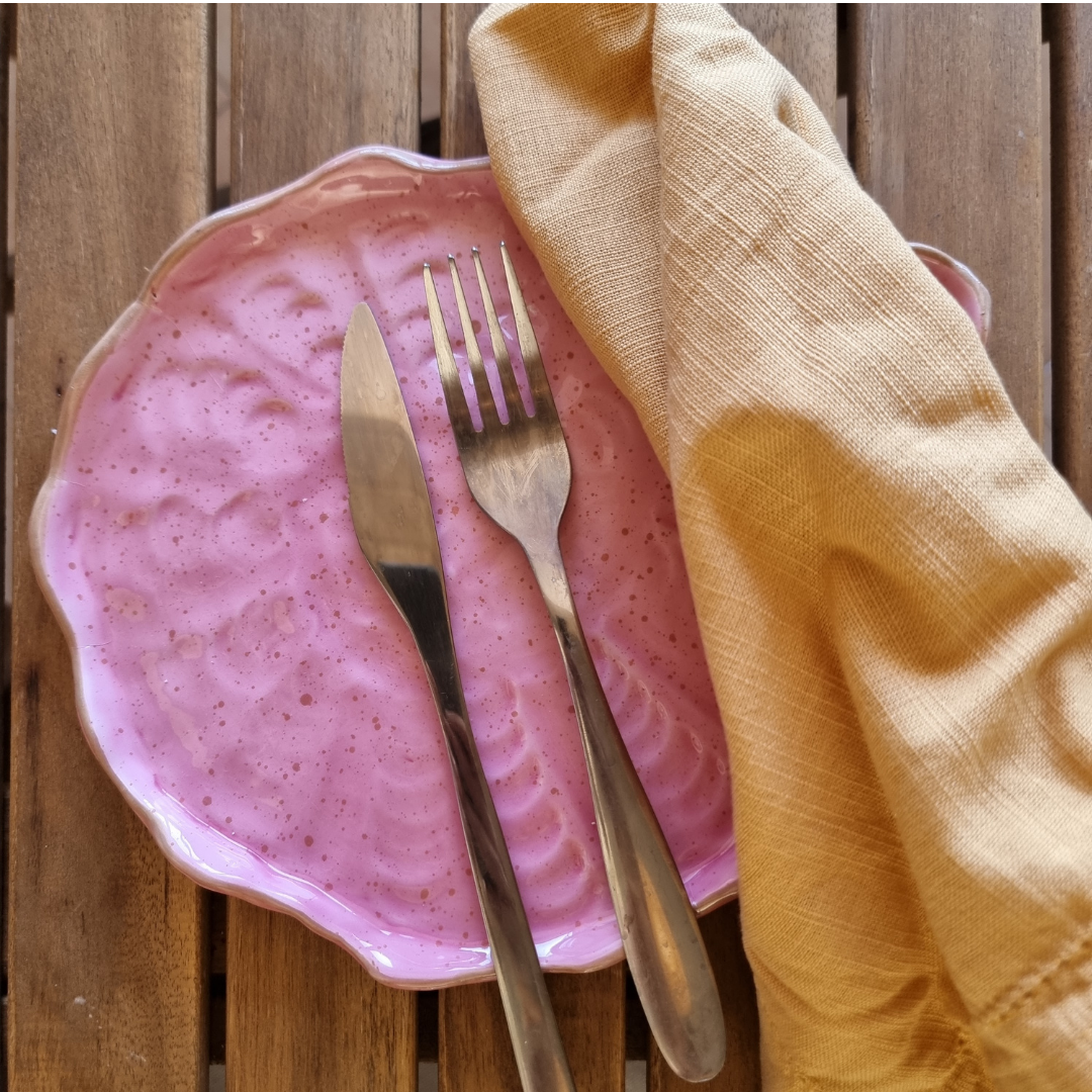 - Design Details: The plate’s radiant pink surface is beautifully contrasted by a deep brown border, accented with playful details that add character and vibrancy. The design is modern and timeless, making it suitable for contemporary settings.