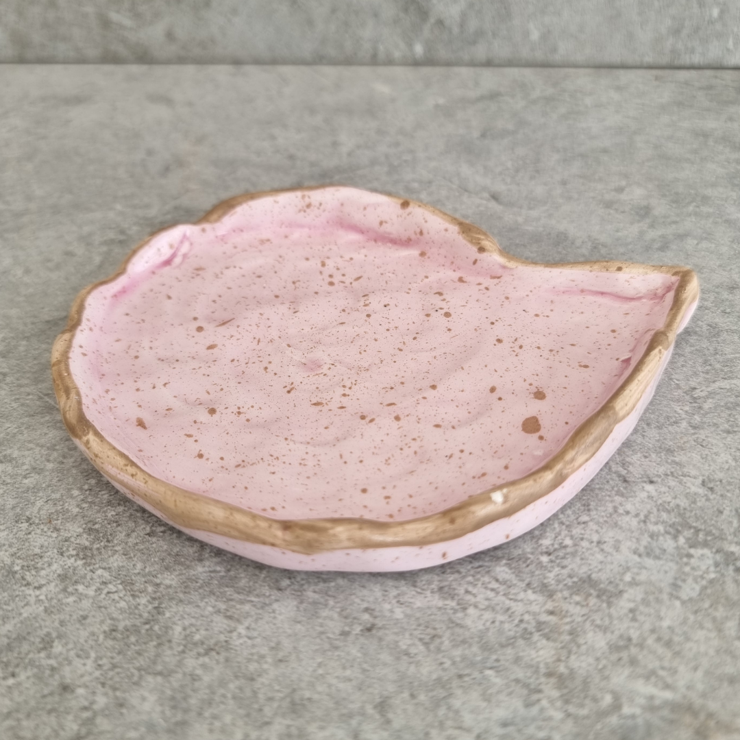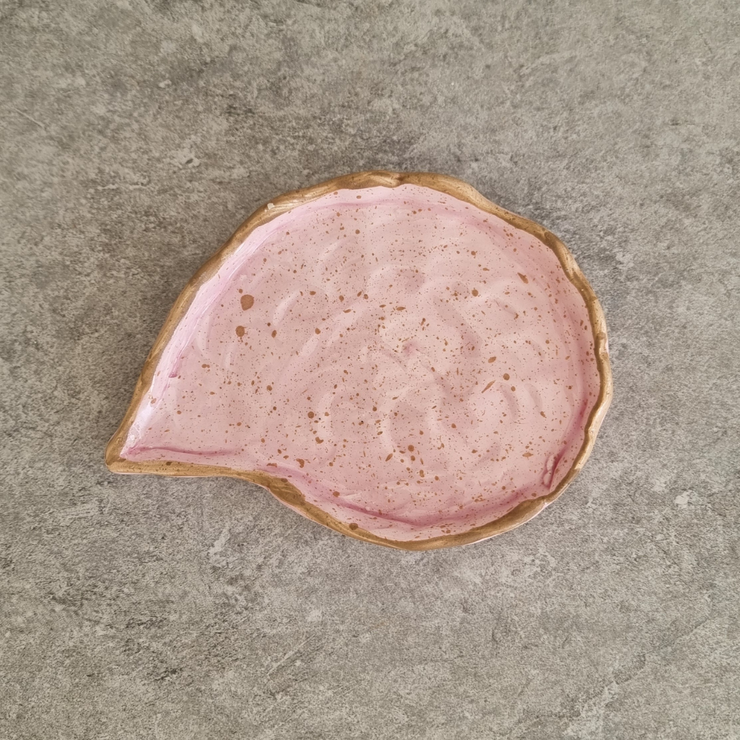 - Unique Design: The plate’s vibrant pink surface is beautifully contrasted by a deep brown border and playful dotted accents, blending modern charm with timeless elegance. It is all made by hand.